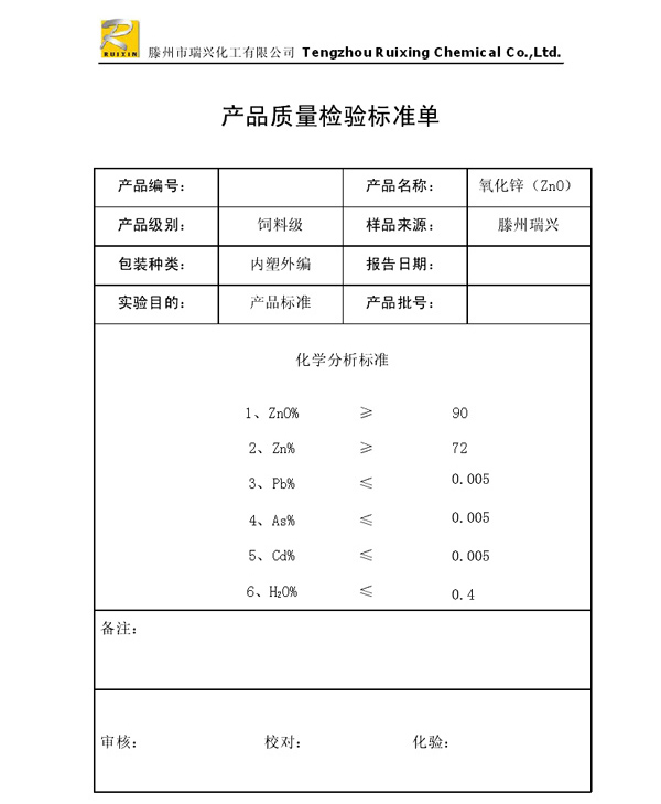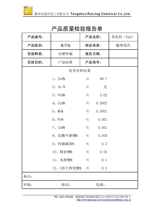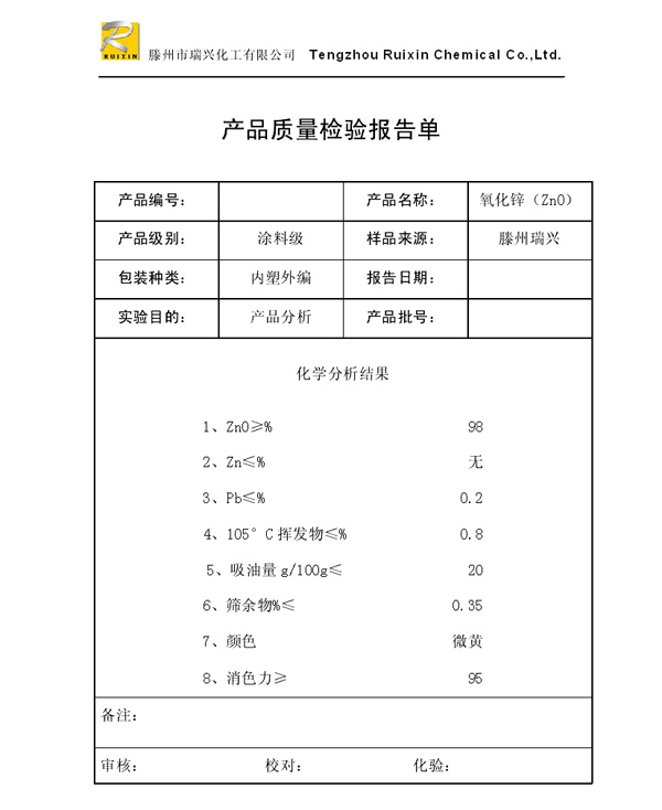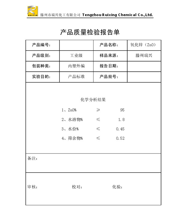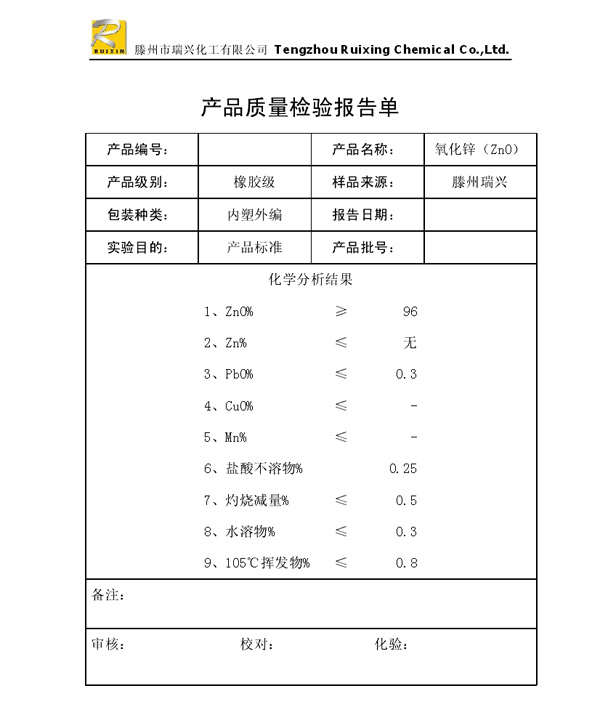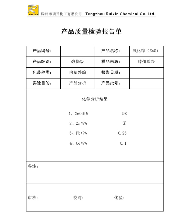 瑞興化工有限公司是生產(chǎn)氧化鋅的重點(diǎn)企業(yè),于2008年通過ISO9001:2008質(zhì)量管理體系認(rèn)證。“瑞興”牌氧化鋅在國內(nèi)擁有較大穩(wěn)定的市場(chǎng),并遠(yuǎn)銷東南亞、中東、中南美等國家和地區(qū),在國內(nèi)外享有較高聲譽(yù)。